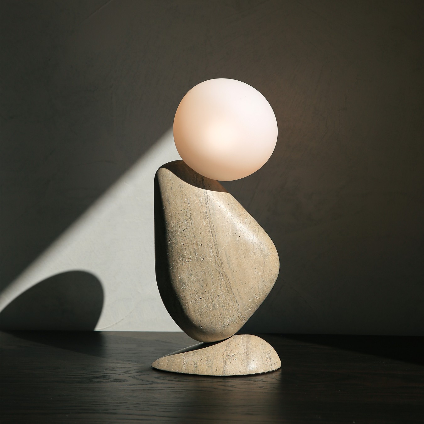 A delicate interplay of balanced forms and proportions, Ben is a symbolic sculpture of meaning and personal significance, offered in a palette of hand-carved, solid stone base options and a blown glass globe, uniquely crafted for each piece. Ben is made to order, created especially for the person and space it is meant to adorn.
