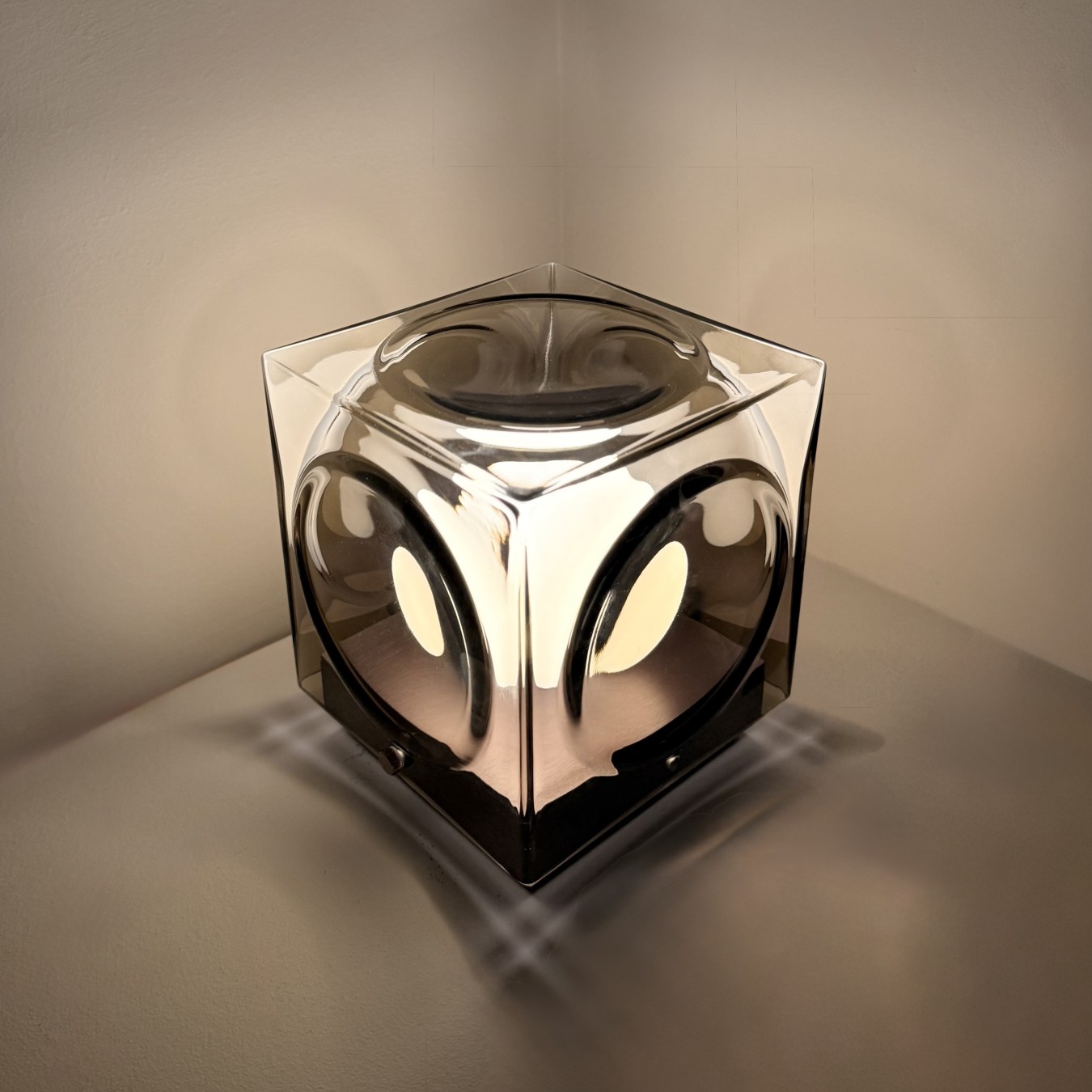 Chant was inspired by architectural glass blocks from the 1970s which I’ve always been drawn to, especially those at the Maison de Verre in Paris. I wanted to take that strong, cubic form and turn it into something softer and more atmospheric, so the hand-blown glass includes a circular indentation that diffuses the light. It was important for me to use glass and metal, both for the weight they give the piece and for their longevity. This version of Chant is portable and able to be used anywhere, indoors or outdoors, so its fully weather resistant, ready to adapt to whatever space you place it in. With the new smoked glass edition, I wanted to bring another layer of warmth and atmosphere. The smoked finish adds a retro feeling and also acts to highlight the sculptural quality of the piece.