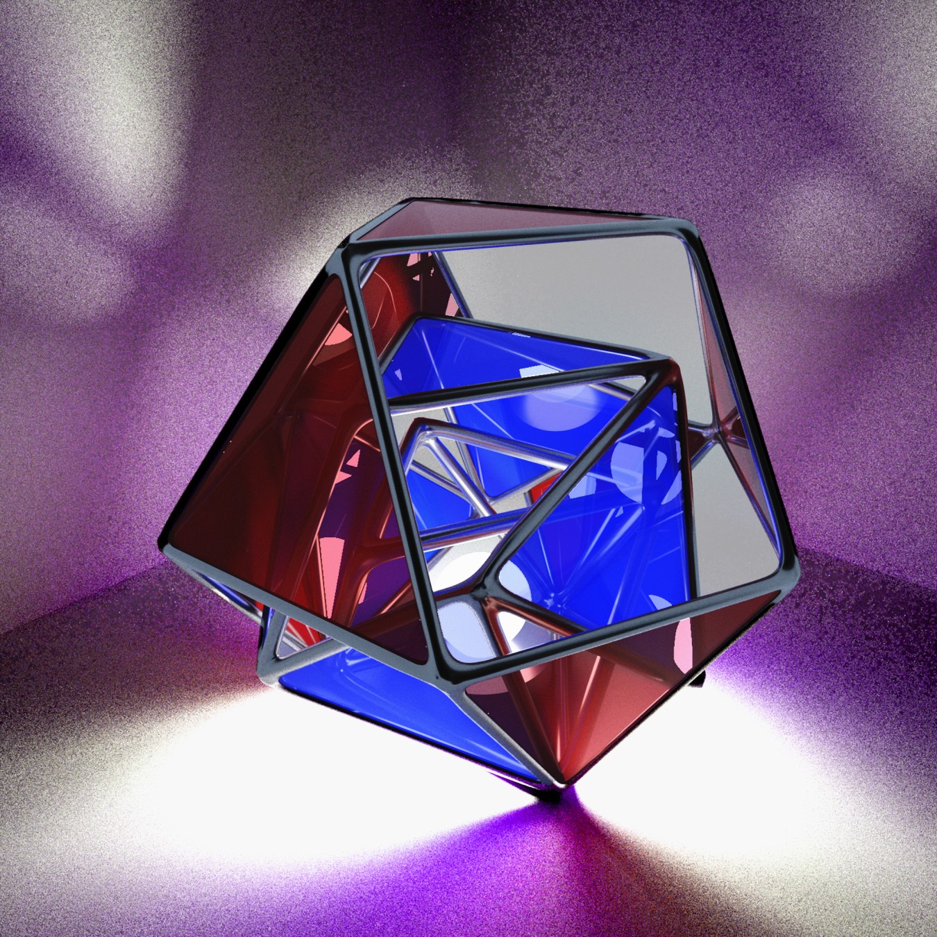 Deep ocean lamp is inspired by SINCLAIR COLLECTIVE's previous research on this space without horizon, light, or firmness, robbing humans of our body’s tools to comprehend and navigate space. The form of the lamp echoes Buckminster Fuller's "Jitterbug," a geometry that can transform between polyhedral states that is also known as vector equilibrium, a structural logic in tune with the fluidity of deep ocean space. Red and blue color filters animate the "Jitterbug" transformation and project colors outwards. Blue light wavelengths travel farthest in the deep ocean, making red objects appear black. This light and the colors it projects onto the wall are counterintuitive: inspired by a space without light, yet colorful. Warm in tone, yet also cold.