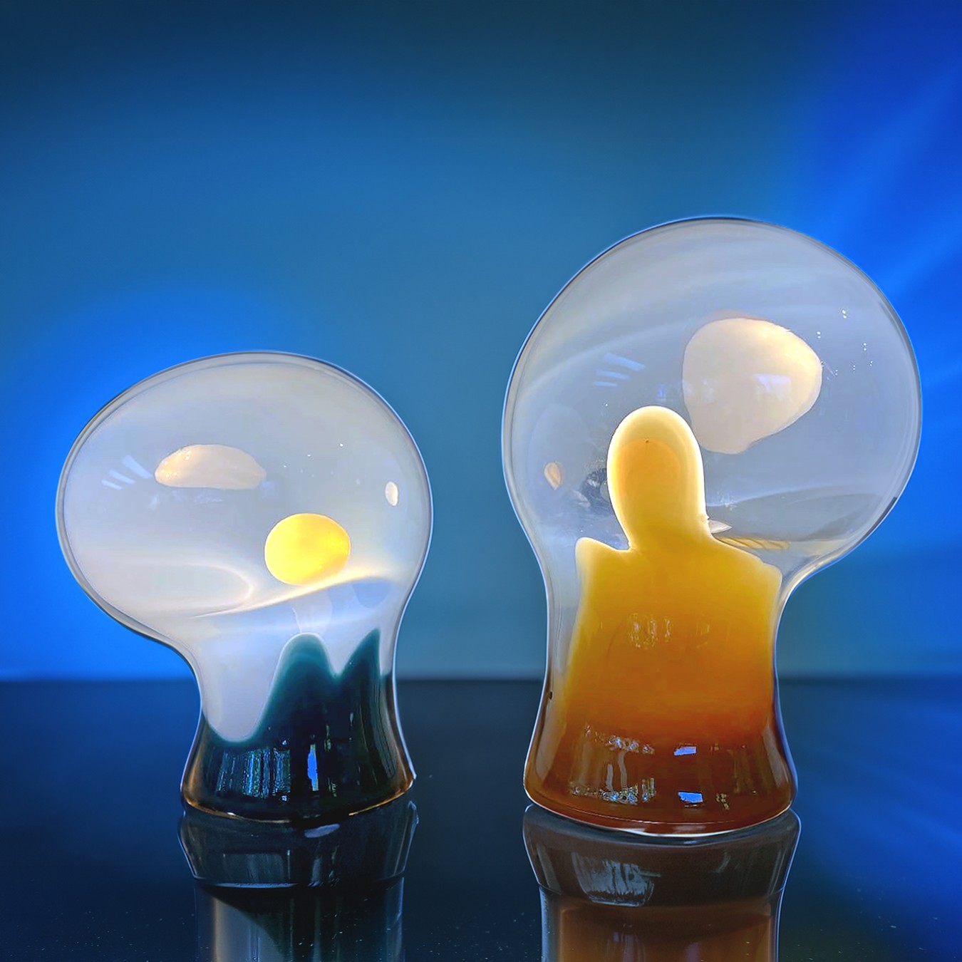 One of the defining characteristics of the Eclipse Portable Lamp is the way the light is integrated directly into the glass form. After the hand-blown vessel has cooled and been annealed, the light fixture is drilled straight into the body of the glass. By embedding the light in this way, the Eclipse maintains a clean, uninterrupted silhouette with no base or extra hardware. Not a lamp with a glass shade—it is a luminous glass vessel designed to glow as a whole. The object and its function are inseparable.