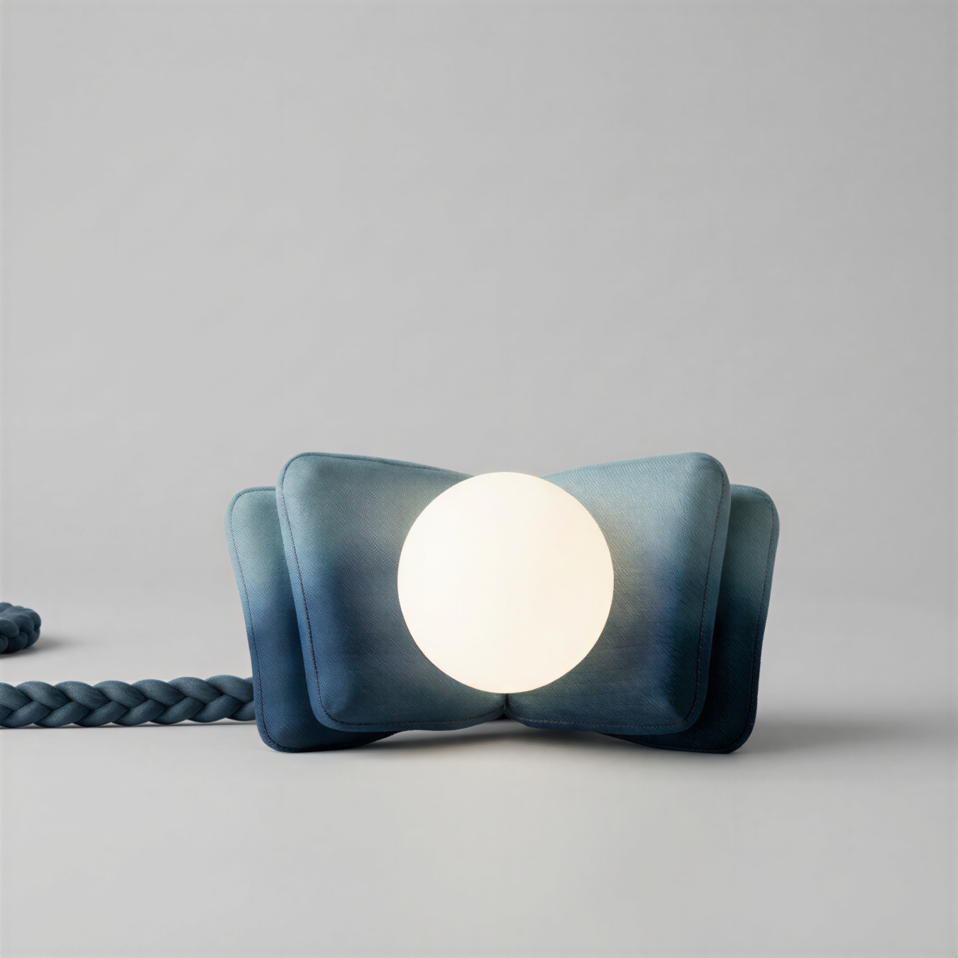 Using upcycled denim allows me to connect sustainability with the cultural narrative, transforming a familiar textile into a sculptural, tactile surface that carries new meaning. The braided cord also invites interaction, letting users engage with the light while recalling traditional motifs. This project is about translating heritage into contemporary lighting; Miindo blends history, craft, and personal expression through material and form.