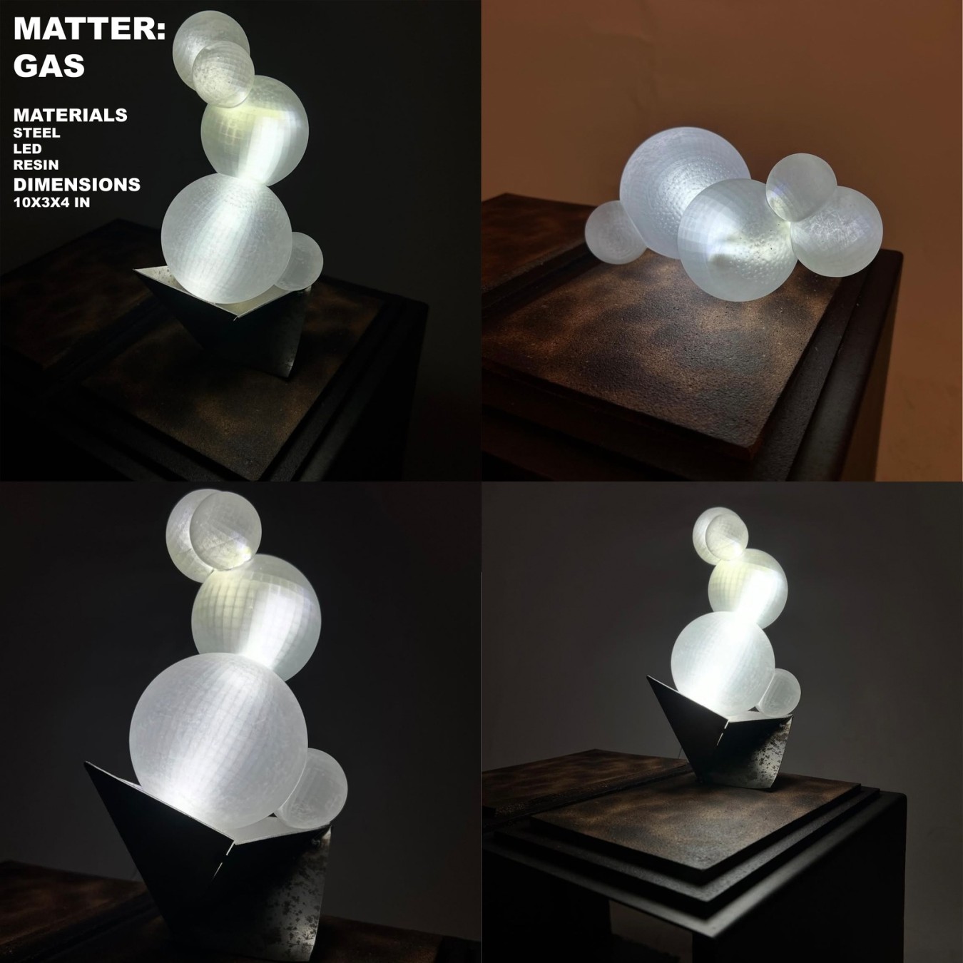 THIS COLLECTION IS LIGHT ILLUSTRATED IN PHYSICAL FORM. THE CONCEPT BEGAN WITH THE QUESTION OF HOW CAN I MAKE LIGHT AN INTANGIBLE MATERIAL AND CONFINE IT TO A SPACE THAT IS MORE FAMILIAR TO OUR PHYSICAL SENSES. THIS LED TO A STUDY OF MATTER AND ITS FORMS. A SOLID IS SOMETHING HEAVY TACTILE AND RIGID. A GAS IS SOMETHING THAT RISES AND MUST BE CONTAINED. A LIQUID IS SOMETHING THAT FLOWS AND IS FREE WHILE ALSO BEING WITHOUT FORM TILL CONTAINED. I TOOK ALL OF THESE CONCEPTS AND APPLIED THEM TO THE FORM OF MY LAMPS TO CREATE SOMETHING NEW AND YET STILL FAMILIAR.