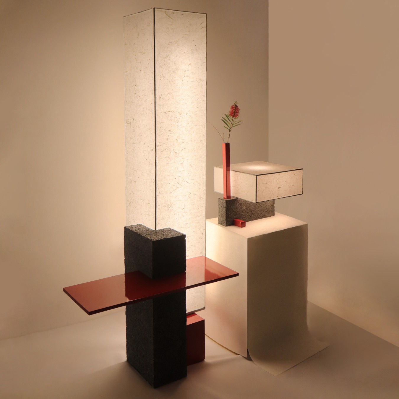SOLL is a sculptural table lamp informed by the bold geometry of Mexican modernist architecture. Composed of volcanic stone, hand-crafted mulberry paper, and powder-coated steel, the piece explores a dynamic tension between weight and air, texture and light, softness and solidity, movement and stillness, and tradition and modernity.