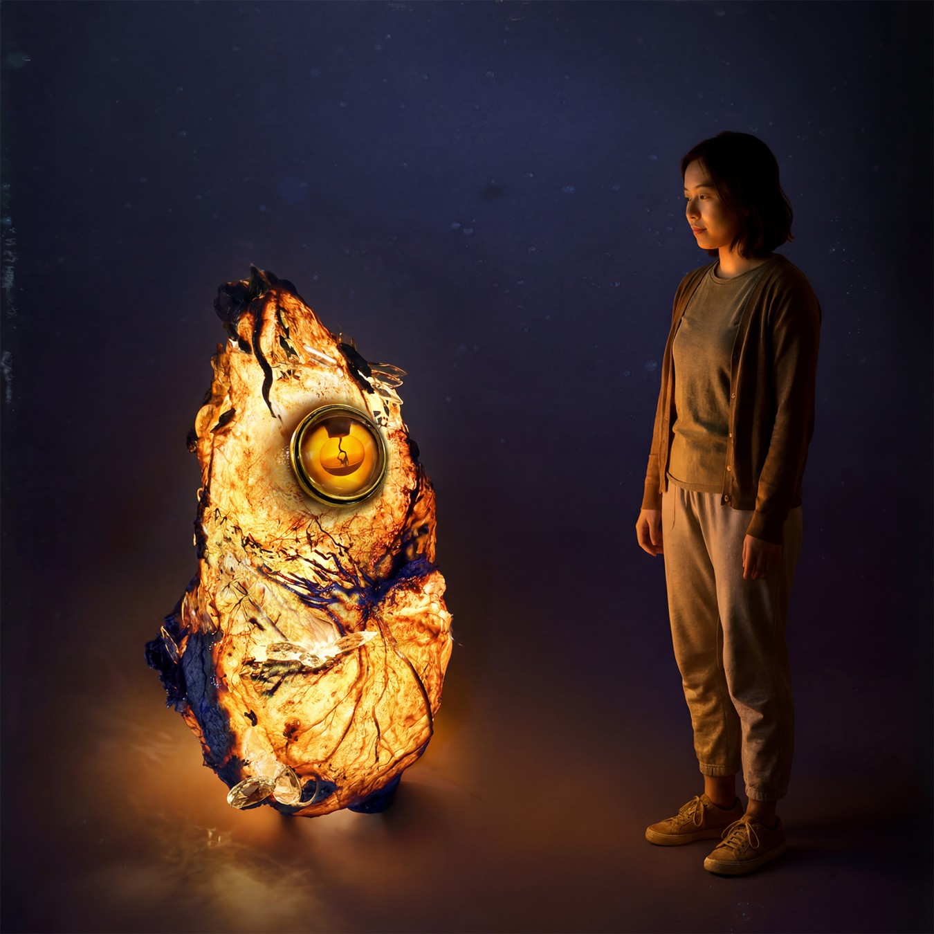 Within this enclosed environment, a mushroom develops under shifting conditions produced by the system itself. The heat emitted by the light creates condensation, forming a microclimate that directly influences the organism’s growth and continuously modifies its life cycle. The viewer’s presence becomes an active agent, not only unveiling the interior but shaping the conditions of life within it.