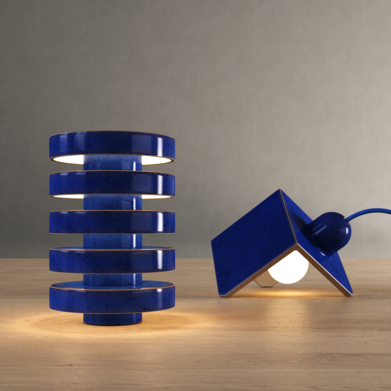 Two lighting objects, Tower and Shed, both made of ceramic. Tower consists of stacked disks separated by cylindrical center pieces that house bands of LEDs illuminating the undersides of the disks and providing ambient light. Shed is an open cube that can be placed orthogonally or diagonally to orient light in different directions. Lightbulb and socket are an integral feature of the design.